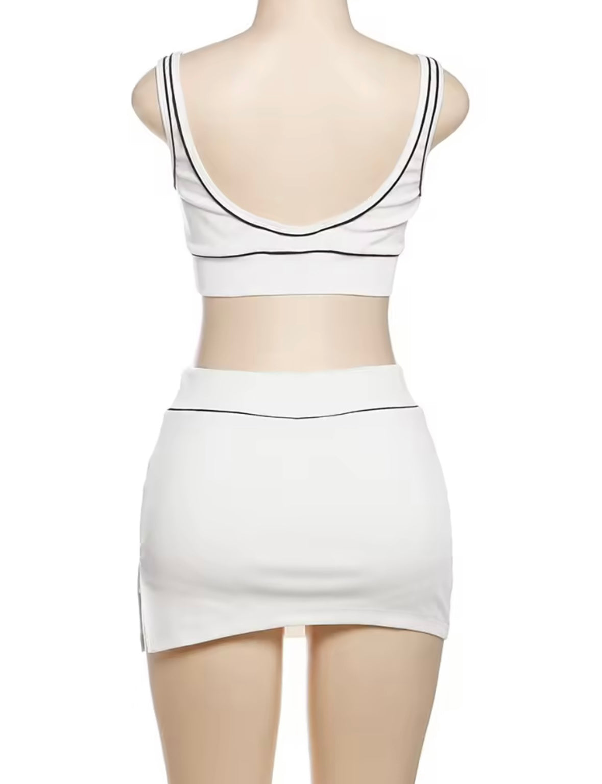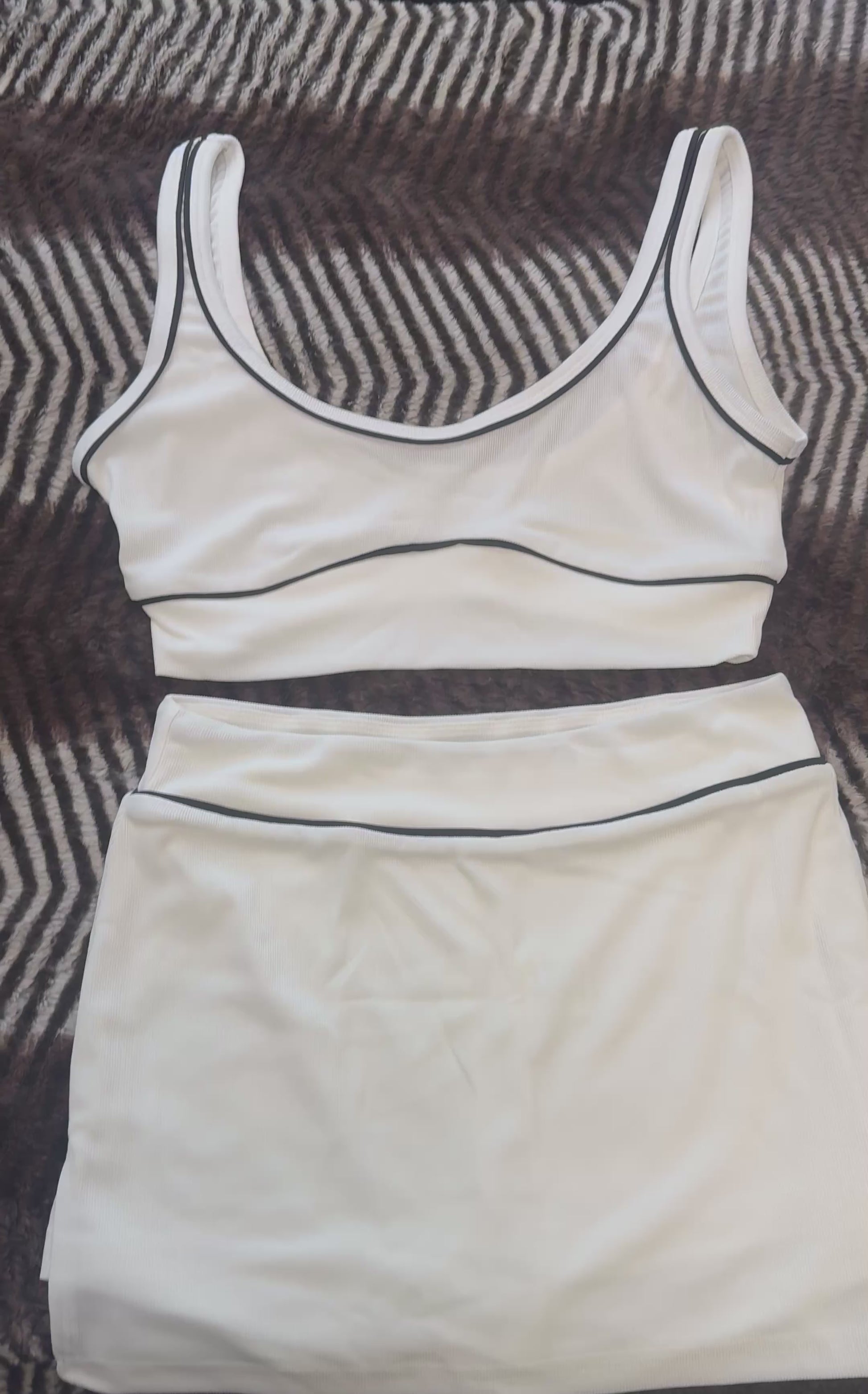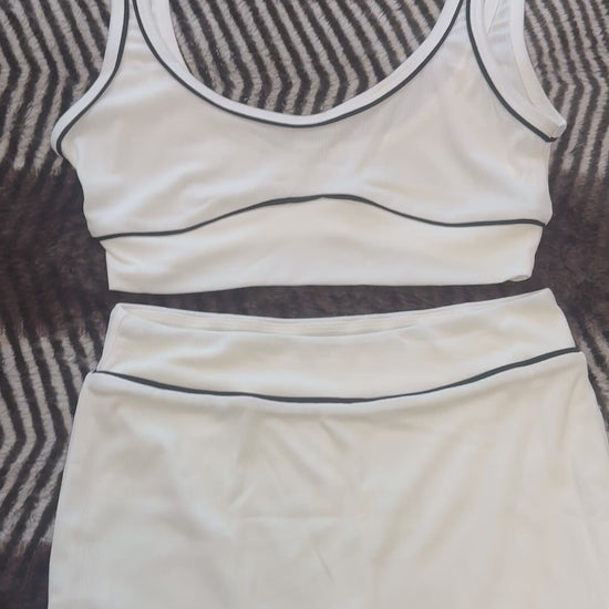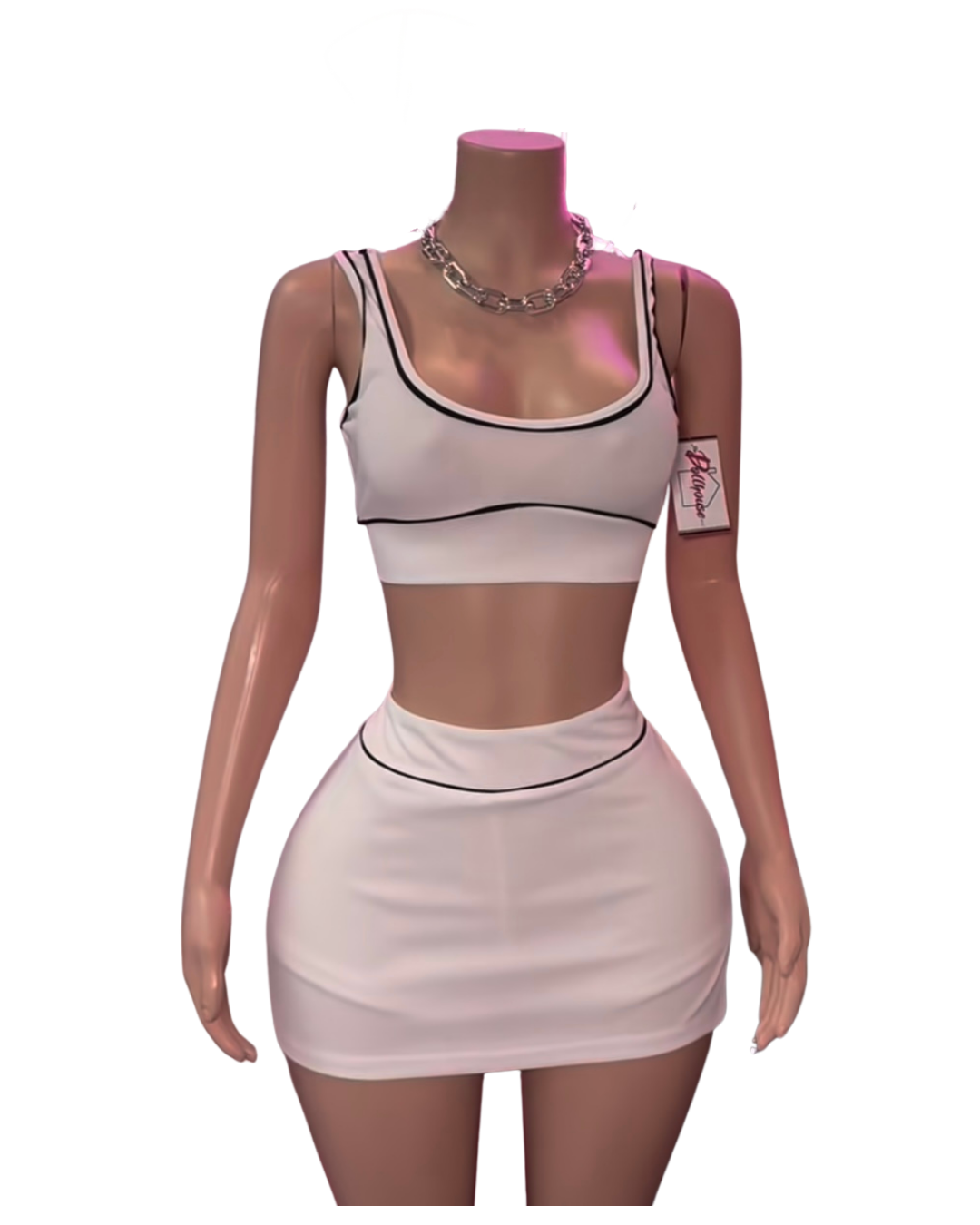 Serving sporty, sleek & effortlessly sexy — the Courtside Cutie Set is your new go-to for when you want to keep it cute and casual. This 2-piece set features a fitted cropped tank with contrast piping details and a matching high-waist mini skirt that hugs all the right places. The crisp white with black trim gives off luxe tennis-core vibes that you can rock from brunch to a night out.